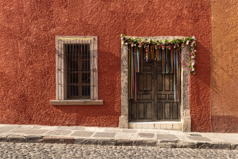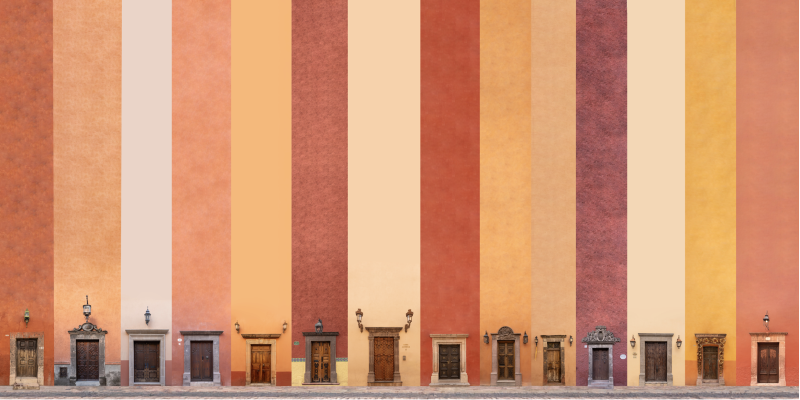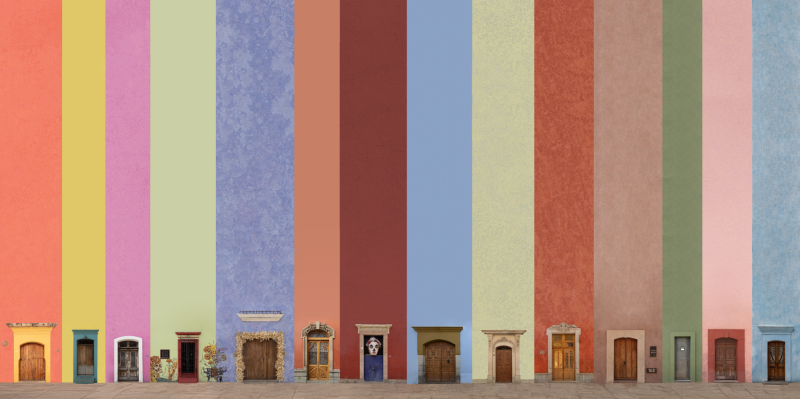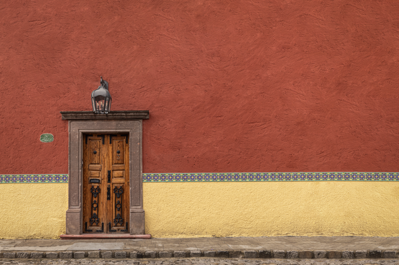 “La charla del Zaguán” explora las fachadas de distintos pueblos y barrios mágicos de México, despojándolas de la mayoría de sus elementos para jugar con su esencia visual y simbólica. Al conservar únicamente las puertas y algunos detalles —como faroles o ventanas— y elevar desproporcionadamente los muros, las composiciones invitan a una lectura diferente del espacio. La paleta de color adquiere un protagonismo emocional, mientras las puertas, reducidas en tamaño, exigen la atención del espectador y lo enfrentan con la intimidad del acceso, con el misterio de lo que permanece oculto detrás.
